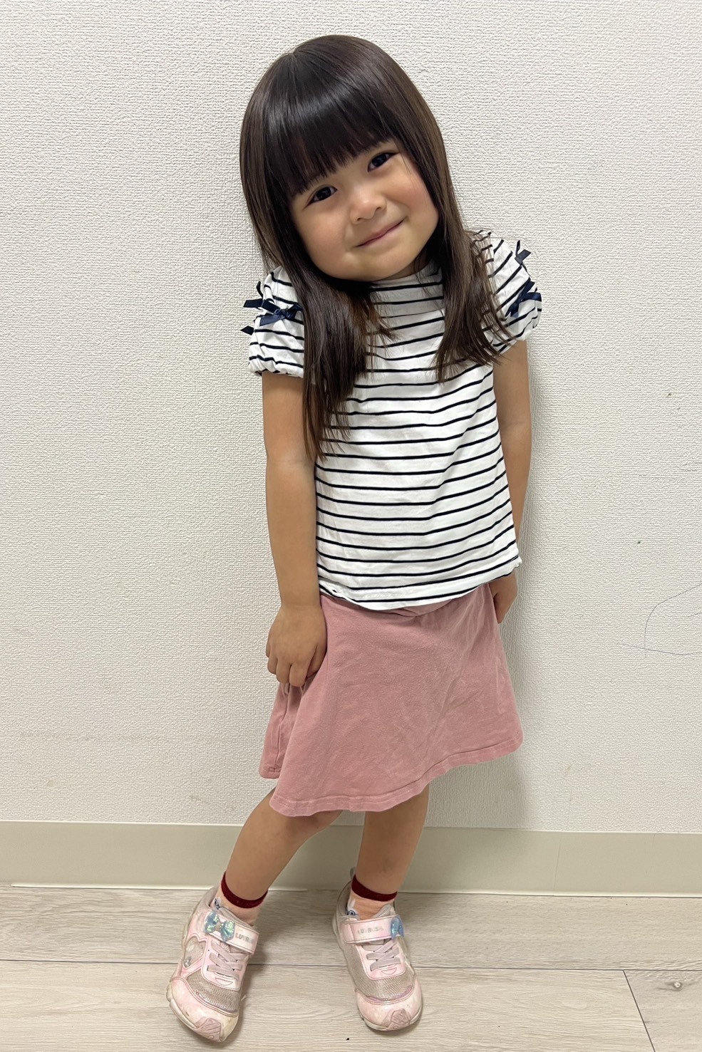 かわいいもの、きらきらしたものが好きな女の子です。服や小物も大好きで、中でもプリンセスのようなドレスはとても嬉しそうに着ています。いつも踊ったり、おふざけしたりしているとても明るい子です。気分屋なところが玉に瑕ですが、それを含めても女の子らしい女の子です。兄弟も多いことから、色んな場所に行ったり、大人と関わる機会も多いので、人見知り、場所見知りがないところも強みかと思います。
